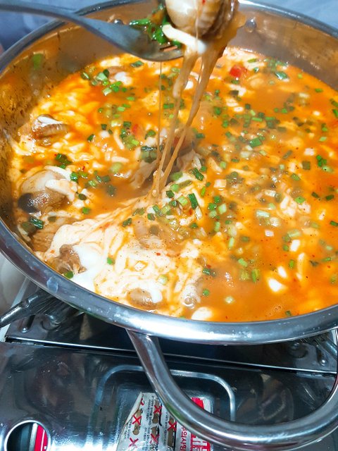 가리비를 2kg사서 그대로 삶은 후에 알맹이만 빼낸 후 냄비에 가리비, 가리비 삶던 물,초장,고추장..등등 넣고 끓이다가 위에 치즈를 잔뜩 뿌려주면