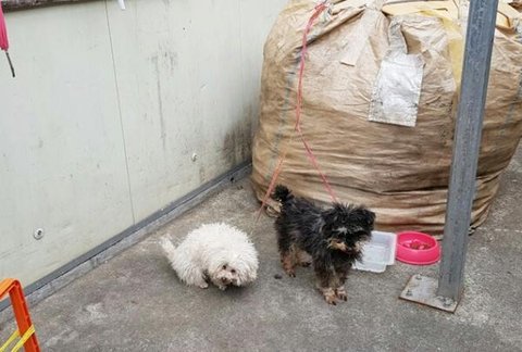 대구 선산에 성묘를 마치고 올라오는길에 한 휴게소에 들렸는데 한쪽 구석에서 개가 짖는 소리가 나 소리가 나는 쪽으로 가보니 두마리의 작은 강아지가 누더기 털을 한채 줄에 묶여있었습니다.