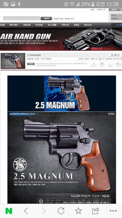 아카데미과학의 스미스웨슨 2.5인치 38구경 리볼버야 아래부터는 짧게 리볼버라고 할게 ㅎㅎ 이 리볼버는 현재 우리나라 경찰에서도 사용하는 리볼버야 최근에 너무 강한 살상력으로 뉴스에도 몇번 나왔지?
