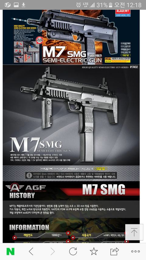 이번에는 Mp7이네 ㅎㅎ 위에 나온 총기들도 그렇지만 이 총도 실제로 존재하는 총이라 바로 알아봤어 이 제품도 아카데미과학의 m7전동건(실총은mp7이고 비비탄총은 m7인 이유는 실총회사와 라이센스계약을 하지 않았기 때문이야)