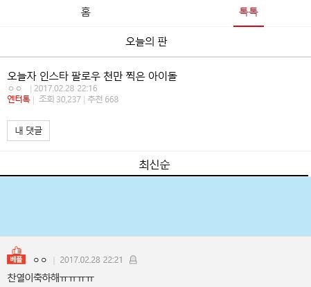 찬열이 인별 천만 추카글 톡선 위로 올려주자 추천수는 많은데 댓글이 없어서 안 올라가는듯