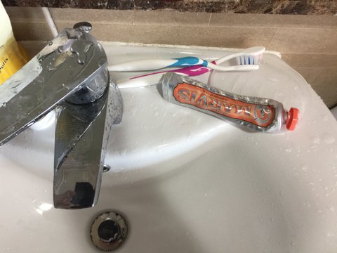 노란치약을 세워놨더니 발견을 못 했는지 처음으로 제가 쓰는 마비스 치약을 쓰더니 "웩 너무 매워 습습" 하고 있길래 얼른 들어가서 확인했습니다. 주먹으로 그냥 꾹쥐어짜는 식으로 치약을 짜는 것 같네요 반으로 저런식으로 접히다가 어쩌다보면 뒤틀리게 되나봅니다.