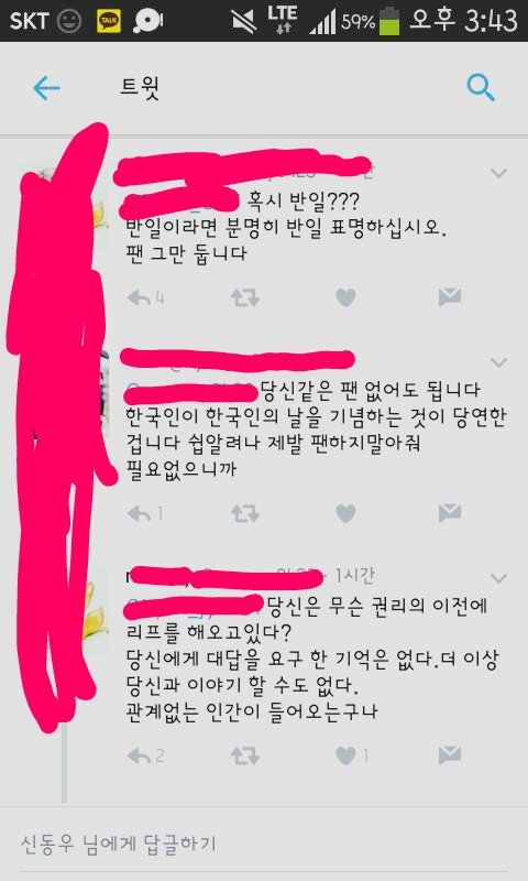 하지만 일본팬들은 이에 대해서 신우에게 반일피드백 요구
