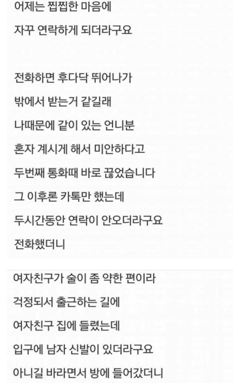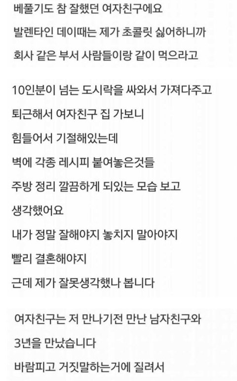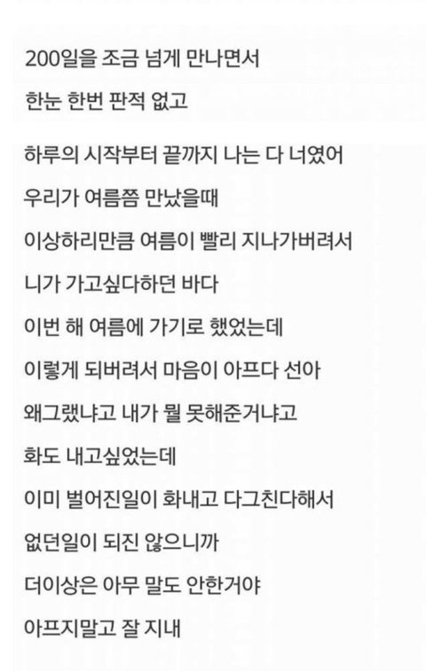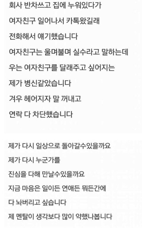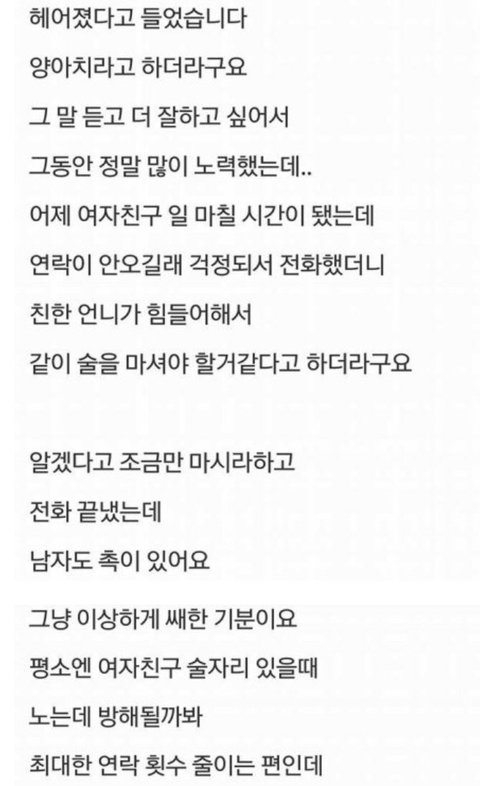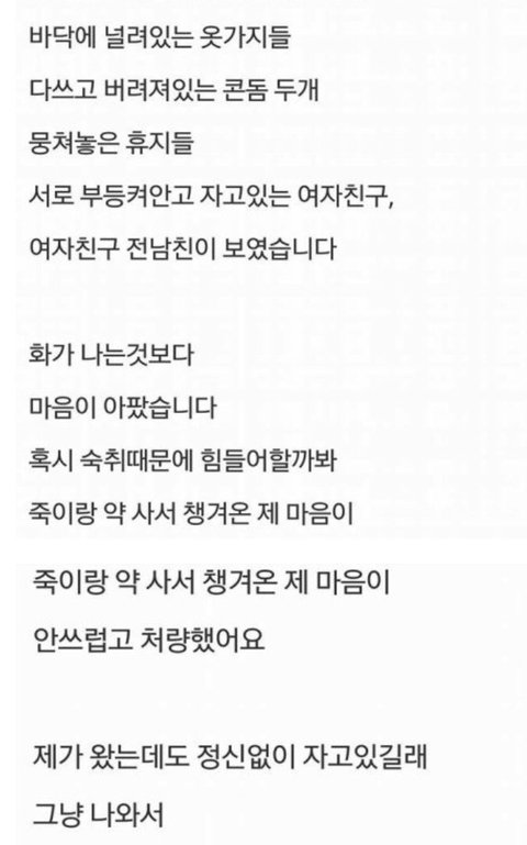 사이다 결말이 아니라고 하는데 저게 바로 사이다예요. 봐주지 않고 아파도 헤어지고 더이상 연락을 받아주지 않는다면, 그 상처와 고통은 오롯이 여자에게 돌아갑니다. 여자의 죄책감은 그만큼 커지는거죠. 평생 잊지못할 흑역사일겁니다, 여자에게도. 잘한거예요.