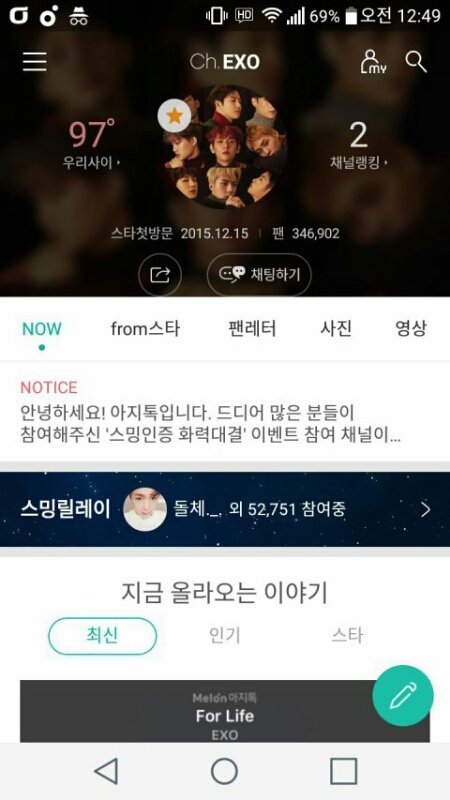 아2지2톡 메뉴에서 엑소채널 들어가서 스밍릴레이 클릭 ㄱㄱ