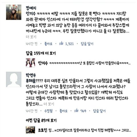 ㅋㅋㅋㅋㅋㅋ우리 쟤네한테 사과받았냐 글고 인스타테러는 3명중 2명 어그로라고 밝혀진게 언제ㅋㅋㅋㅋㅋ지네는 실트운동 2만명이서 하지 않았나