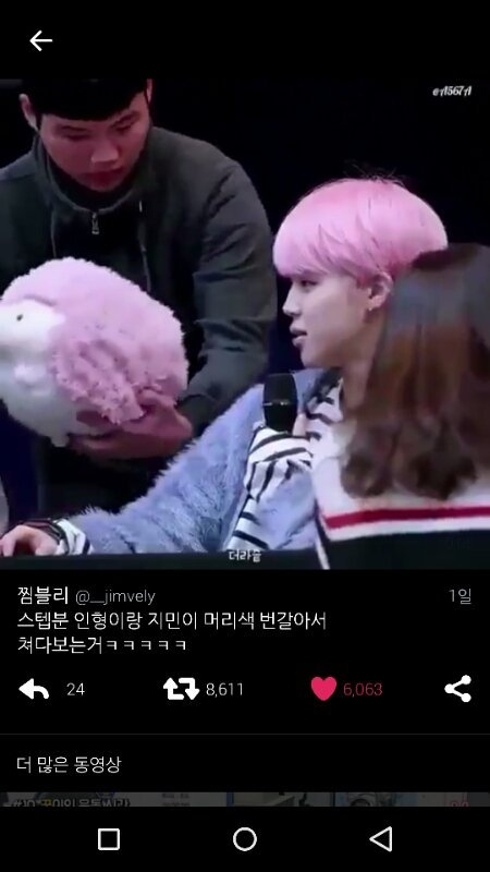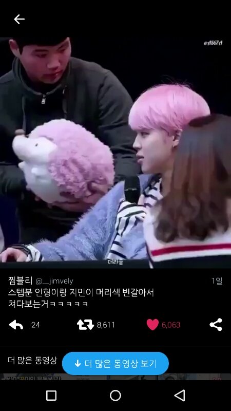 아진짴ㅋㅋㅋ지민이랑 머리색이똑같으니까 한번 쳐다보고간닼ㅋㅋㅋ개웃곀ㅋㅋㅋㅋ
