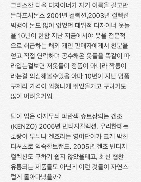 탑옷은 겐조 2005년 빈티치상품으로 최신상품도 아님 그래서 구하기도 힘들고 근데 이옷을 버젓이 착용함 전혀 흔한상품도 아닐뿐더러 구하기도어려운데 굳이 똑캍이 입고 나온건 ???
