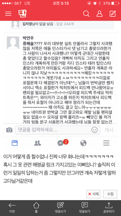 이번 ㅍㅈ 해명글 링크있는 이삐 있니.. 저기 진짜 무개념인 우리팬들도 있고 대화가 안통하는데 ㄹㅇ 답답해 미쳐버릴거같애 기세등등한게 너무 화나