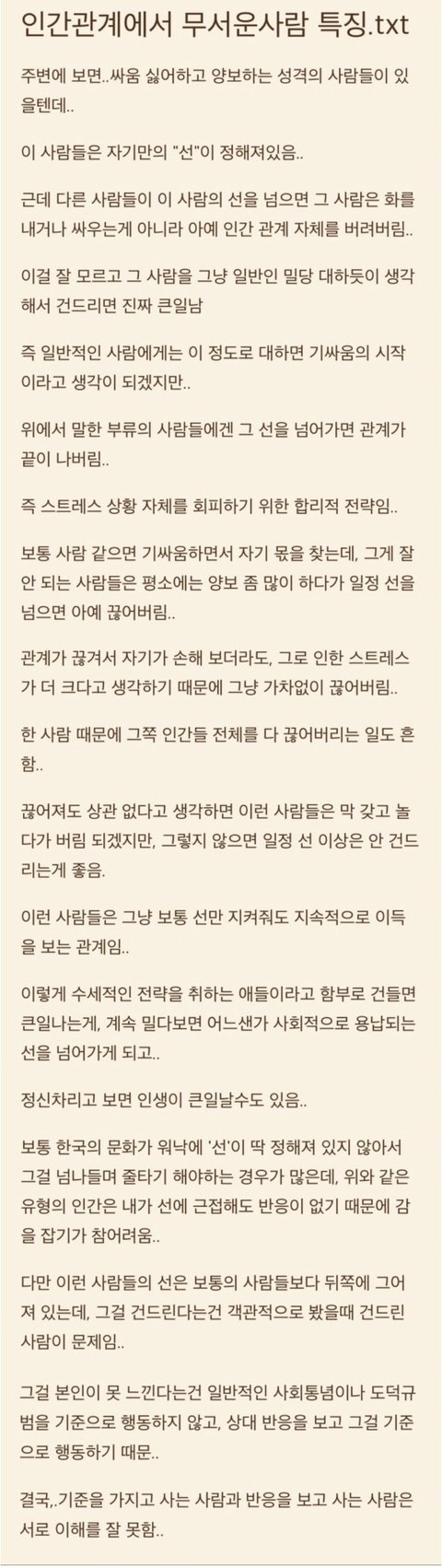 참다가 관계 끝내 버리는 사람보다 무서운 사람은 자기 행동의 기준을 윤리에 두는 게 아니라 그 사람 반응에 두는 사람이다. 사람 봐가면서 그래도 되는 사람이면 마음대로 행동하고 이용하는 사람. 약한자에게 강한 사람. 그리고 글본새 참 글을 쓴 사람이 제일 무서운듯