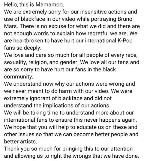 저희는 인종, 성적성향, 종교, 젠더를 불문하고 모든 사람들을 사랑하며 생각합니다. 저희는 모든 마마무팬분들을 사랑하며 그 중 흑인 커뮤니티의 분들께 상처를 드려 매우 죄송합니다.