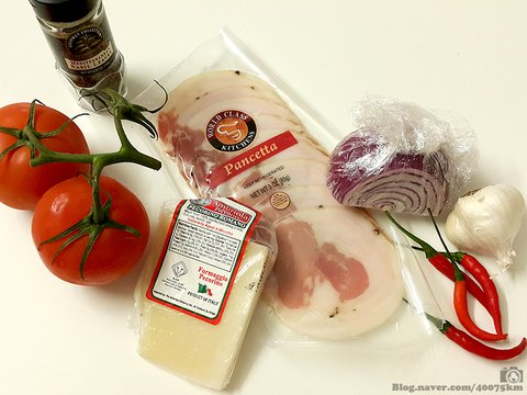 토마토, 페코리노 치즈, 이탈리아식 베이컨인 판체타, 페퍼론치노 고추가 기본 준비물입니다.