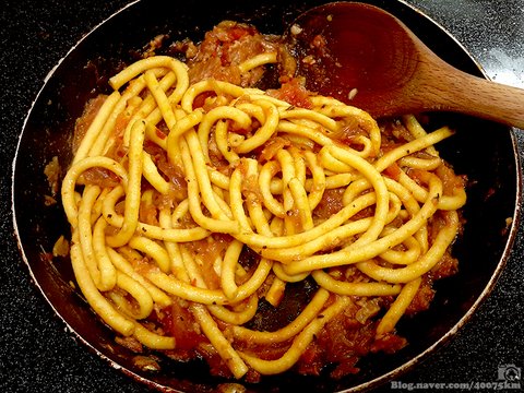 소스를 끓여서 졸이다가 어느 정도 걸쭉해지면 삶은 면을 넣고 저어줍니다.