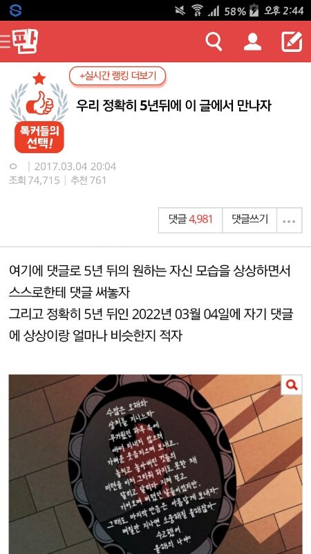 이 글보면서 너무 슬펐어, 그리고 나 또한 댓도 남기고 여러 사람들의 원하는 미래도 봤고. 근데 너무 슬프다 ... 진짜 5년뒤에 만나자.
