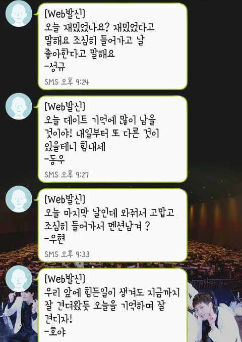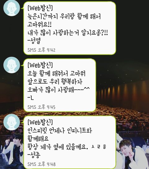 그거 한국팬들한테 들려준다고 가사번역해서 불러주고 또잠실실내 체육관 3층이 진짜 경사가 가파르다고 소문났는데 팬미팅도중에 팬들이랑 게임한다고진짜 거기까지 뛰어올라가고 춤도 같이 추고 연기도 하고 보여주고싶은건 다보여줌.내가갔던 팬미팅중에 제일 혜자였음 진짜ㅠㅠㅠㅠㅠㅠ 서로 헤어지기 싫어해가지구ㅠㅠㅠㅠㅠㅠㅠ 원래 사실 인피니트는 기본으로 2시간30분은 찍고 하는애들이긴한데 4시간은 인피니트 공연중 사상 최초 아닌가 싶음..