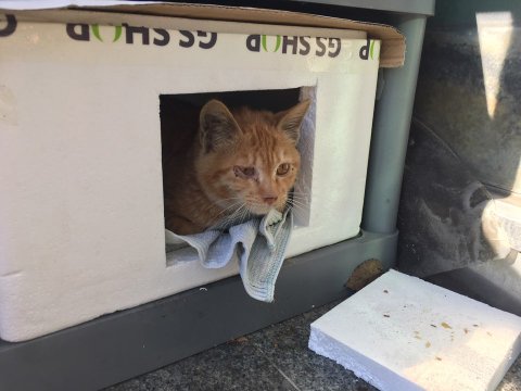 고양이를 잘모르는 사장님부부가 스티로품 집도 주고 이뻐해주며 돌봐주시던 길고양이였어요. 눈이 아픈거같다며 남편이 이동장을 가져오라하여 데려온 아이예요.<길에서 지내던 시절>길고양이에겐 드물게 온 복이다, 생각했는데 당당이눈을 생각하면 참 다행스러운 일이예요.당당이는 구조후 병원 검진시 눈이 안좋아보인다 하여 안과전문병원에서 검사를 했습니다.일단 백내장으로 진단을 받았고 , 현재 수술을 하거나 할필요는 없으며 안약을 넣으며 관찰해야 하는 단계로, 앞으로 증상이 나올수도 있고 아닐수도 있다. 이부분에 있어 앞으로 당당이가 백내장 수술을 받게된다면 그부분에 있어서는 제가 비용을 부담하겠습니다.