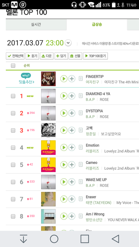 브ㅇ앱 때문인지 몰라도 300계단이나 오름ㅠㅠㅜ얼마나 뒤에 있었으면.....ㅎㅎ 자정 넘으면 순위올리기 좋으니까 열스하자!! 이게 실시간 차트였다면ㅠㅠㅜ