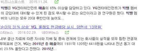 반면에 금융 공시자료에서 YG 2015년 1931억 매출 절반이상의 비중을 빅뱅이 차지한다고 발표했음