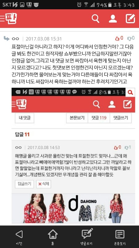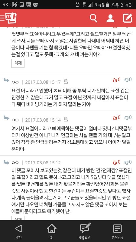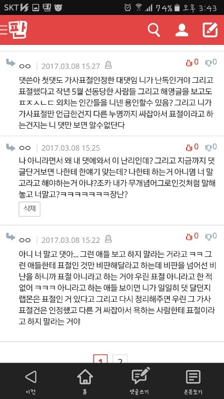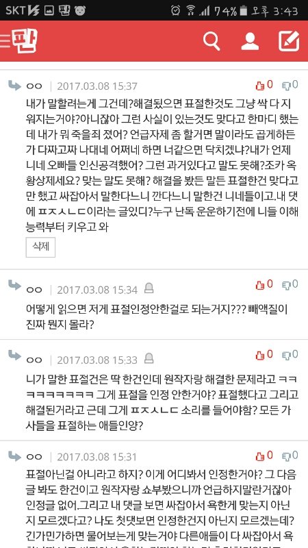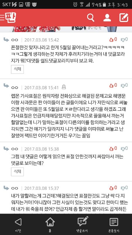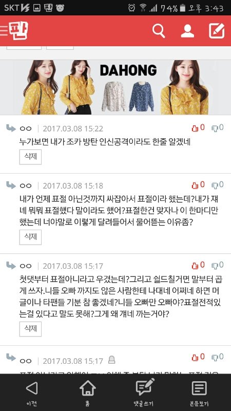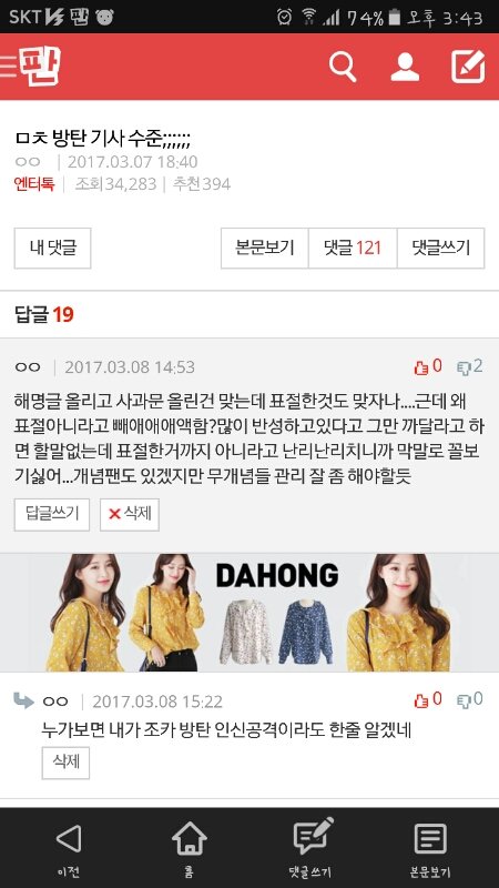 내가 못할말했냐?내가 방탄 싸잡아서 쟤네가 말하는 ㅍㅈㅅㄴㄷ이랬냐?표절한거맞자나한마디 했는데 이렇게 물어뜯겨야 해?ㅋㅋㅋㅋㅋㅋㅋㅋ방탄 노래도 좋고 안무도 엄청 멋있어서 우와아아 했는데 무개념팬들 덕분에 정나미 뚝 떨어진다