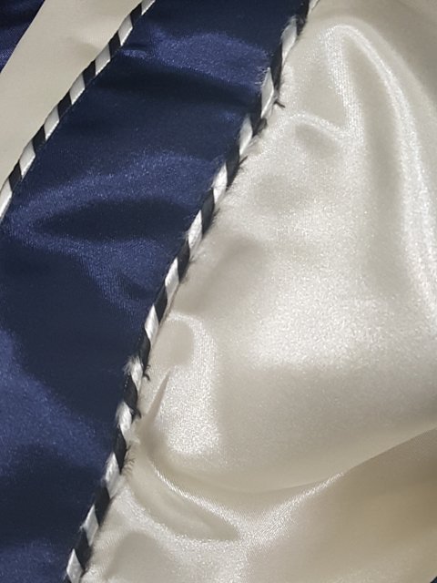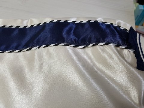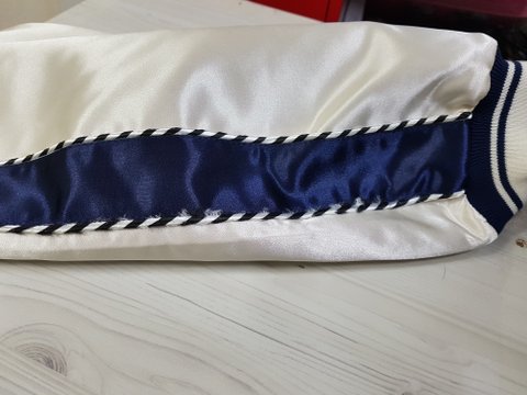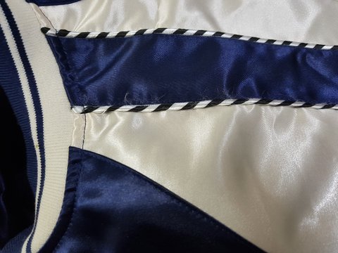 어깨부터 소매까지 오는 파이핑 장식된 실이 풀려서옴