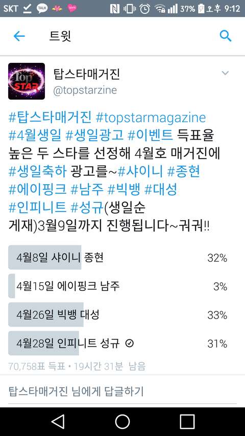 19시간 남았으니까 주변 분들께 홍보하구 투표 꾹꾹 해주자ㅠㅡㅠ