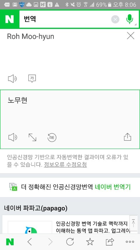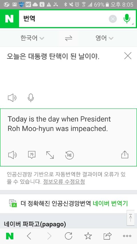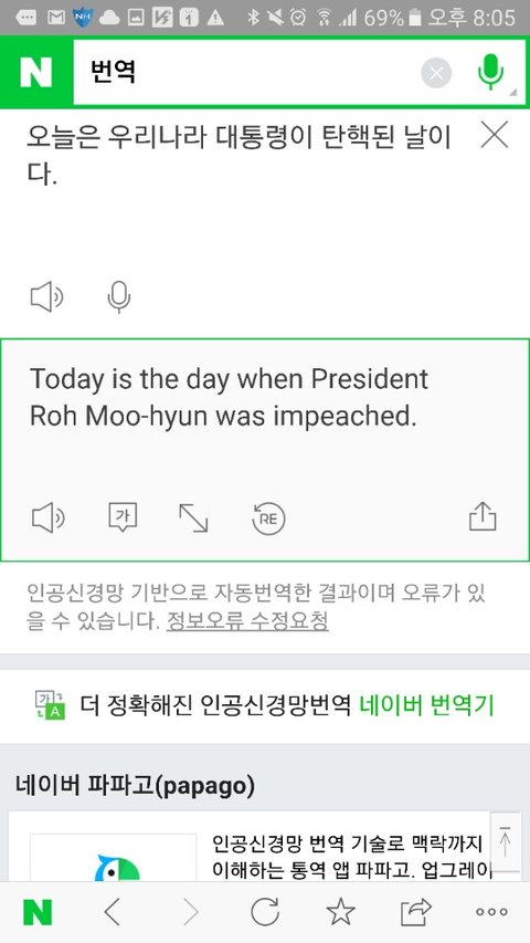 일단 방탈죄송합니다. 제가 외국인친구가 있어서 오늘 탄핵에 대해 얘기해주려고 번역기를 돌렸거든요. 네이버 파파고 번역이요. 근데 탄핵만치면 자꾸 노무현 전 대통령 성함이 거론돼요. 왜그런거죠? 제 폰이 이상한건가요? 저는 노무현 전 대통령 존함을 번역기에 돌린적도 없습니다
