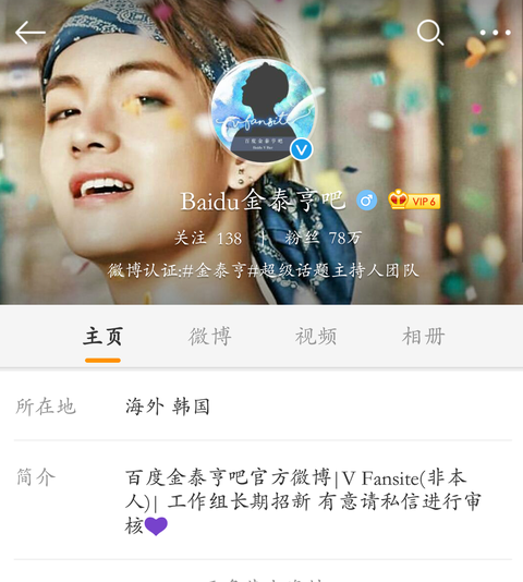 바이두 김태형 빠팔로잉 138 팔로워 78만.....소개: 바이두 김태형 빠 official웨이보|......