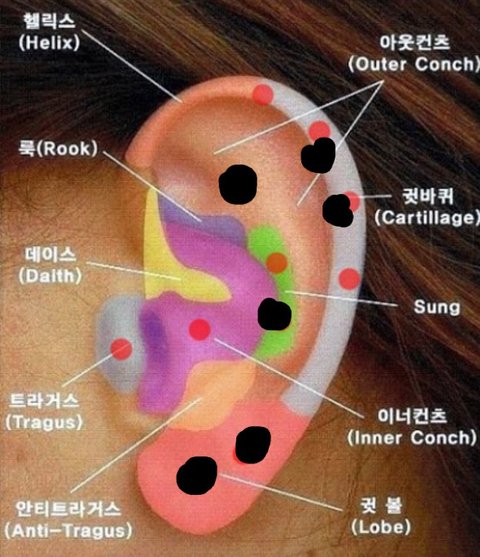 검은색으로 점 찍은곳이 지금 뚫어놓은덴데 트라거스 뚫고 싶음ㅜ 오바냐