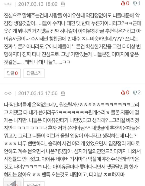 저기 댓글들 한사람인지도 모르겠는데 말하는 거 개웃기네..저기 댓글에 올렸는데 못볼까봐 한마디 복붙해서 할게.저댓글 다 니가 쓴거 아니라고 했는데 또 너는 저중에 몇개는 너라고 인정을 하네? 야그리고 너는 아이유글마다 쫓아다니면서 댓다니는거 아니고 아이유안티 너만 있는거 아니라고 했잖아 그럼 우리는?우리도 수지태연글마다 쫓아다닐 정신없어 우린 지금 컴백기사 하나만 떠도 하루종일 그거만 생각하고 아이유팬톡에 사람이 많은줄 알아?여기는 거의 대부분이 네이트판 악플을 실감하고 멘탈 적은애들은 판에선 덕질못하겠다고 떠난게 반이야 그리고 수지태연 안티는 다 유애나야? 아 진짜 니때문에 더 짜증나네 막말로 수지태연 안티가 뭐 유애나만 있고 그러디?뭐 인구조사마냥 니가 일일이 다 물어봤니? 달의연인 드라마 시청률 안나온건 대체 뭔 상관임 논점 흐리지 마..우리가 여기서 헉 달의연인 시청률 개쩔어!!하고 우리들이 직접 올려서 뭐 톡선까지 간적있니?이 글에 나온 저 본문글도 아이유영업글도 아니라고 쓰니가 직접밝히고 오히려 좋아한다면 태연 좋아한다 했는데 니혼자 왜 딴소리하고 지 랄이야 사건 있으면 너는 그걸 제대로 읽어주기나 해? 우리가 입장정리를 제대로 안해? 1월인가 2월인가 수지 로리타 논란 글이 톡선에 올라왔을때 그때 우리들은 가만히 있었는데 거기에 있던 딴팬들이 아이유 머리채를 먼저 잡은거고 그리고 베댓이 유애나였어도 왜 수지만 옹호하는 댓글이 많아 왜 수지만 안까?이딴 내용이 아니라 왜 우리때는 이렇게 옹호하는 댓글이 없었어?하는 서운함을 나타내는 내용이었어 야 그리고 나 수지태연 개좋아하거든? 수지 드라마 예쁘게 나왔었고 오프더레코드도 자주 봤었고 태연 이번에 컴백곡 수채화 특히 너무 좋고 유애나는 다 수지태연 안티야? 너도 막말로 아이유 안티가 나만 있니?이딴말했으니까 나도 말할게 막말로 수지태연안티가 우리야? 우리만 있는거야? 니 말이면 거의 뭐 수지태연안티=유애나 이런 개잡 소리네. 야 팬톡오는게 왜 니마음이야 적어도 나중에 올 뒷감당과 책임을 가지고 글을 쓸 생각을 해 아니 걍 오지마 ㅋㅋㅋㅋ아진짜웃기네 저 댓글ㅋㅋㅋㅋ지는 아이유 글에 일일이 올만큼 한가한 사람아니라면서 팬톡오는건 내맘이래 존 나 모순적이네 저 새기