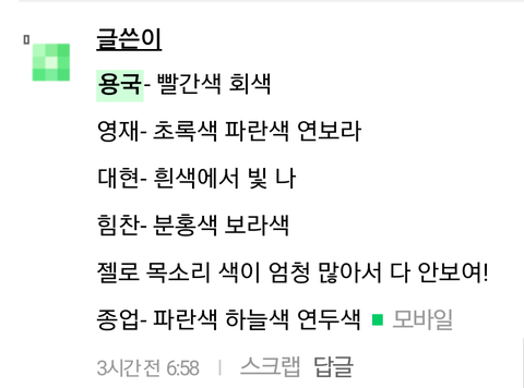 트윗터에서 가져왔는디 대현이 빛난다는거랑 주농이 여러색으로 보인다는게 제일 신기...