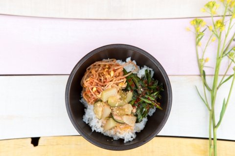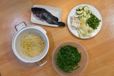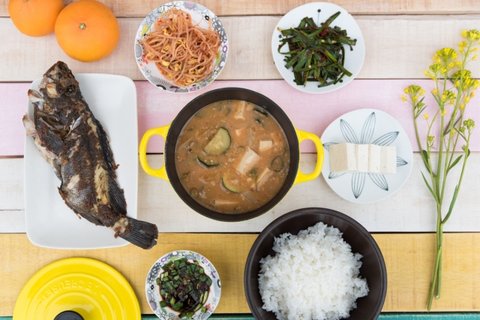 보글보글 된장찌개 우럭구이 콩나물무침,부추겉절이해서 비벼먹는거 좋아요~