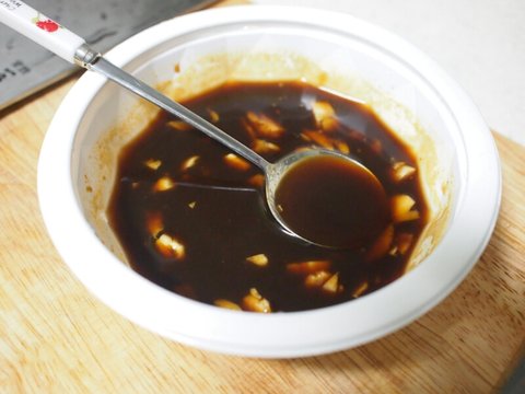 돈까스 소스 3큰술, 굴소스 2큰술, 우스터 2소스, 올리고당 2큰술, 다진마늘 2개.
