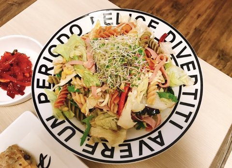 샐러드파스타는 삶은 면에 스위트 칠리소스 버무리고