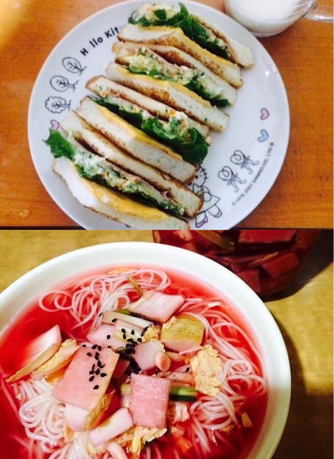 간식으로 샌드위치 해먹고 석류물김치에 소면만 삶아서