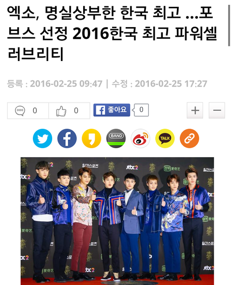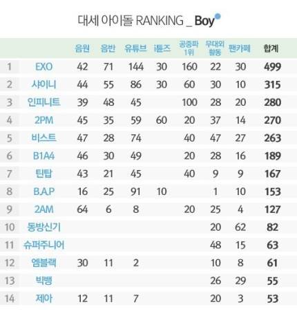 ㅡ가요계 황금시대 또한 니가 정하는 것이 아니고 엑소의 대중성이 1도 없다는건 0이라는 건데, 여러 매스컴에서 내는 파워피플 순위나 셀러브리티 순위에서 몇년째 순위에 오르고 있음. 아래 기사 참고