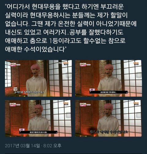 안녕하세요 눈이 예뻐요 멘트+밑에짤 현대무용 멘트를 비슷한시기에 보고서는 지금 지민님한테 단단히 치였어 웅엥....잘생기셨는데 실력좋으시고 겸손하시고 말이쁘게하시고 두루두루 너무 멋있는분이신것같아ㅠㅠㅠㅠㅠ아미들 요즘에 선동질오지게하는 어그로때문에 고생하던데 힘내길바랄게ㅠㅠㅠ지민님 춤 너무 잘추시더라ㅠㅠㅠㅠ(솔로곡까지 찾아듣고있는데 이건 뭐 거의 입덕인가...)