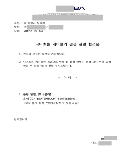 니더호른 케이블카 긴급점검이 과연 3월 6일에 있었는가에 대해 증명서를 보내줄 것을 요구했고, 여행사 담당자는 "1등급 호텔은 호텔명 적혀있으니까 알아서 찾아보세요"