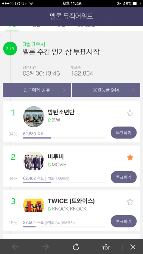 까먹지말고 매일매일투표하세영 눈팅하는 분들도 멜ㄹ론아이디만들어서 투표라도 해주세영 격차한번많이벌어지면 못따라잡아요ㅠㅠㅠㅠㅠ 홧팅❣️❣️❣️❣️