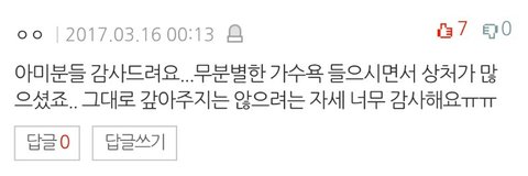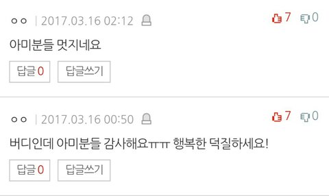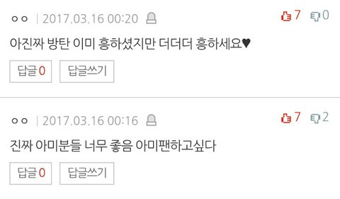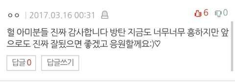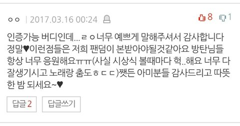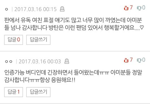글에 다 안올라가서 댓글로도 올릴게 + 여기 중에 방탄소년단이라는 가수가 팬들을 참 잘 뒀네 이 문장 너무 감동임 ㅇㅌㅌ에서 들은 우리 때문에 방탄이들이 좋다 이 칭찬이랑 TOP 2인 것 같아 진짜