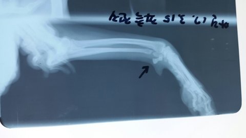 어제 엑스레이 촬영상 왼쪽 앞발 철골이라는 부위에 골절이있었는데 수술할정도로 심각하진 않다고 하세요.