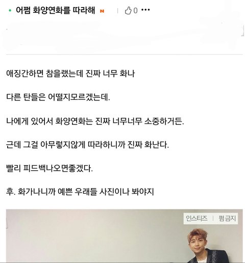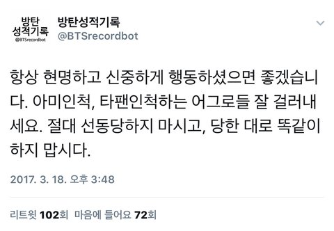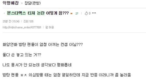 자꾸 인티에서 우리애들 소중한 화양연화인데 안짜증낭?? 이러면서 어그로 끌고 물타기할려고 하더라고ㅋㅋㅋㅋㅋㅋㅋ인1티가 나이어린 아미들 많잖아 그 점을 이용해서 물타기 하려는 수준.. 방탄성적기록봇님도 이렇게 말씀하셨고.. 팬톡아미나 타싸 아미들은 걱정 할 필욘 없지만 인1티 아미들이 너무 걱정이다