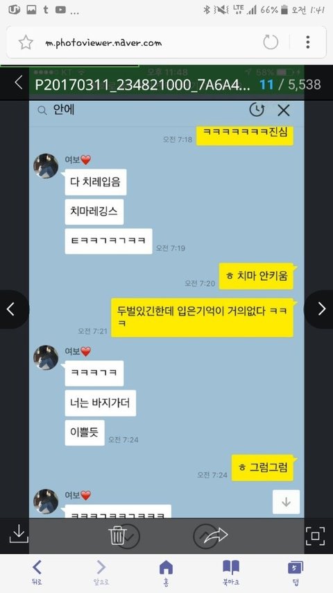 ㅋㅋㅋㅋㅋㅋㅋ 네이버 클라우드를 우연찮게 보게 되었습니다. 갑자기 모텔사진이 몇몇개씩 보이더니 이년이 모텔에 갈 일이 뭐가 있나 하고 위로 올려보던 중 남자사진 몇개와 카톡대화사진이 보였습니다 ㅋㅋㅋㅋㅋㅋ 대화수준은 일반적인 바람현장이지만 이년이 카톡대화창 검색항목에 쓴 단어를 보세요 '섹x', '안에' 보이시죠 ? 성관계를 했다거나 하려고 준비하는 년 맞습니다.