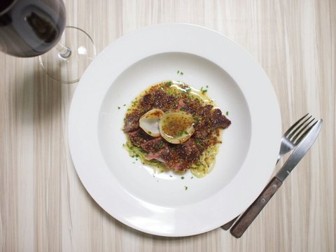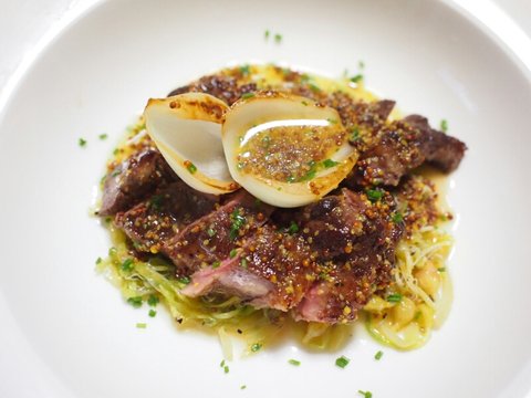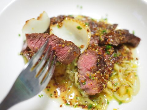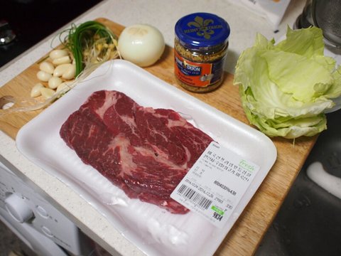 재료는 등심, 양파, 달래, 버터, 홀그레인머스터드, 양배추, 마늘 등