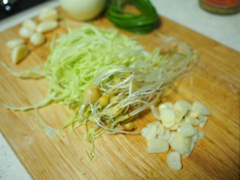 마늘과 달래, 양배추를 가니시용이니까 양배추는 채썰고, 마늘은 편으로, 달래는 뿌리부분만