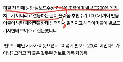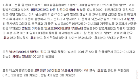 빌보드 200이 메인 차트 아니라고 한 것도 아니고 메인 차트 두 개 중 하나에서 1위했는데 메인차트 두 개 다 1위한 것처럼 말하고 다녔다고 버젓히 쓰여져 있는데 얘네는 도대체 글을 어떻게 읽으면 내용이 바꿔어버리는 건지 모르겠음......