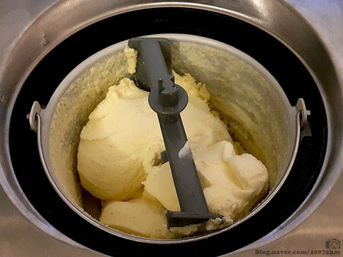 이렇게 만든 아이스크림 재료를 냉장고에 식힌 다음 아이스크림 기계에 넣고 돌리면 완성이지요.
