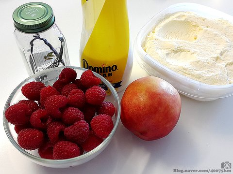 홈메이드 아이스크림 외에도 추가로 바닐라 빈, 설탕, 슈가파우더, 복숭아, 라즈베리가 필요합니다.
