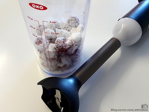 라즈베리 한 컵에 슈가파우더 한 컵을 붓고 핸드 블렌더로 갈아줍니다.
