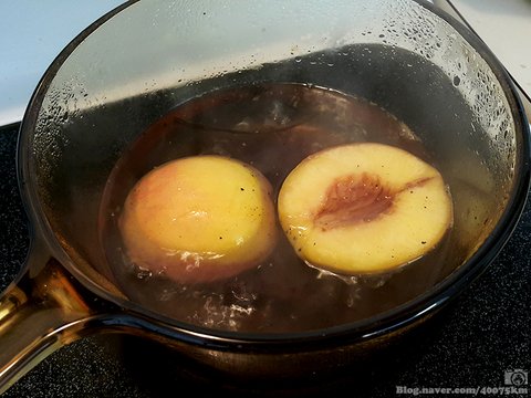 복숭아가 다 익으면 건져내서 식힌 후 껍질을 벗겨냅니다. 냉장고에 넣어서 차게 식히면 준비 완료.