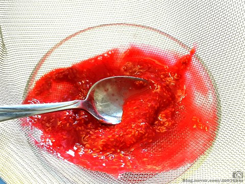 라즈베리 퓨레가 꽤 점도가 있는 편이라 숟가락이나 주걱 등으로 긁어주면서 과즙만 모아줍니다.